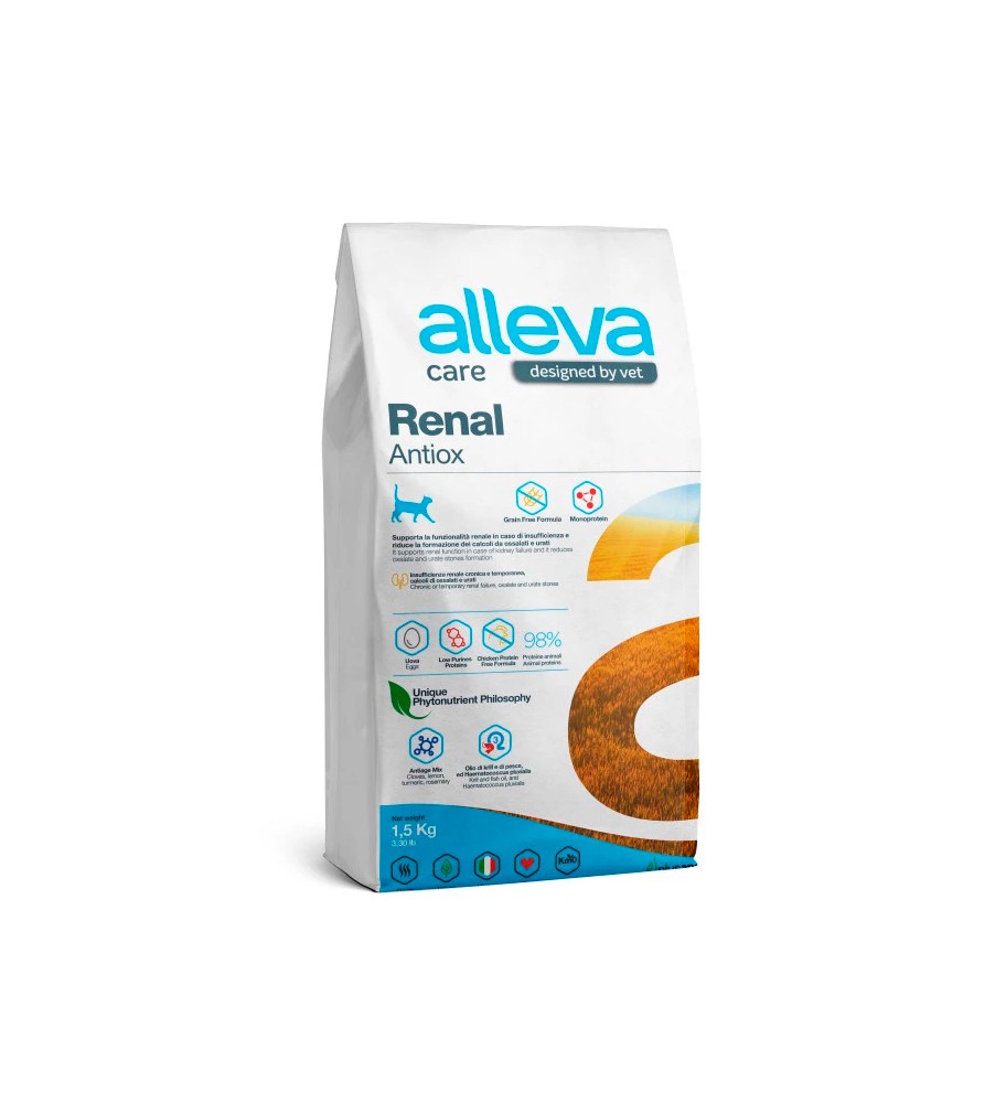 Alleva Care Renal-ANTIOX es un alimento dietético completo para gatos adultos, especialmente diseñado para ofrecer apoyo en caso de insuficiencia renal crónica o aguda, y ayudar a reducir la formación de cálculos de oxalato y urato. Con estos beneficios clave: