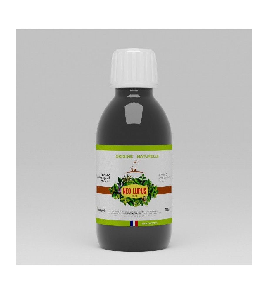 Azymic es una solución oral destinada a animales. Mantener fuera del alcance de los niños. Garantizado libre de aceites esenciales, transgénicos y antibióticos. No exceda la dosis diaria recomendada. ,